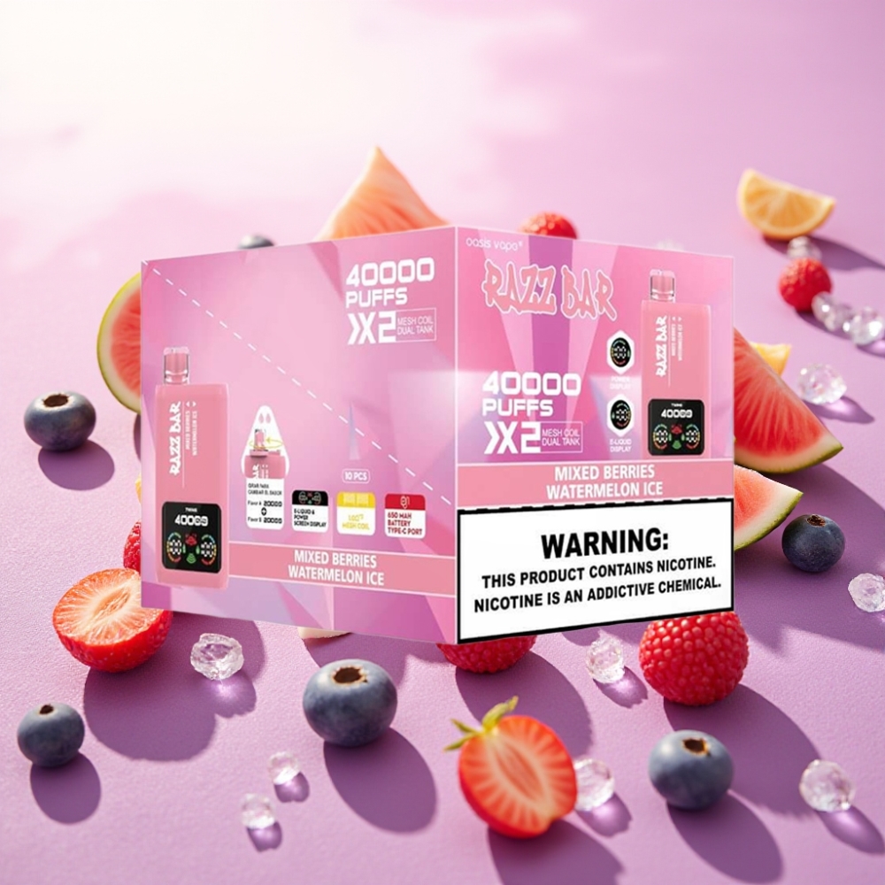 Razz Bar 40000 שאיפות מסוג חד פעמי - תצוגת מסך, סליל משי 1.0Ω×2, בטעם פירות מעורבים ואבטיח קר